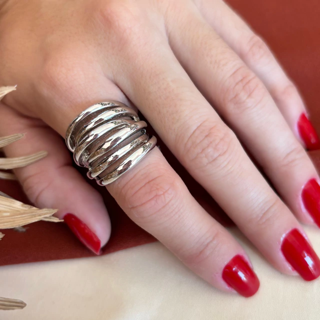 Anel grande, liso, com detalhe em várias voltas vazadas, estilo orgânico. Versátil e super estiloso!