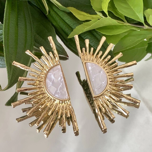 Brinco com madrepérola no centro e bordas trabalhadas no dourado, em formando um "meio sol" .