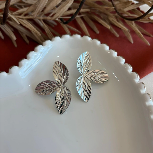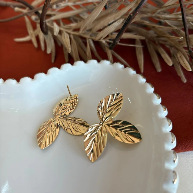 Brinco em formato meia pétala, liso e com detalhes estilo martelado