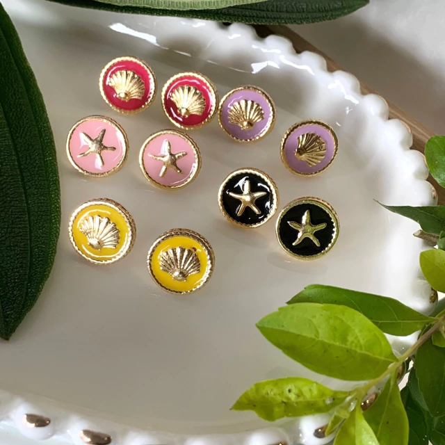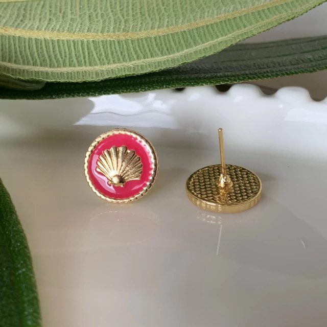 Brinco redondo esmaltado com detalhe dourado no meio de concha
