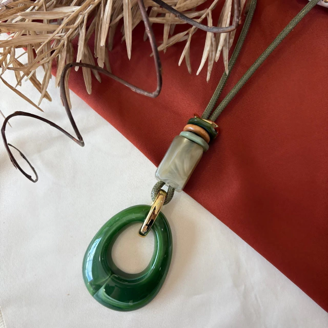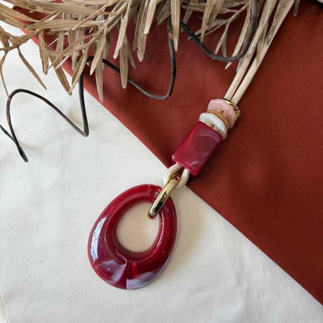 Colar alongado em cordão, com pingente em gota vazada e detalhes em resina