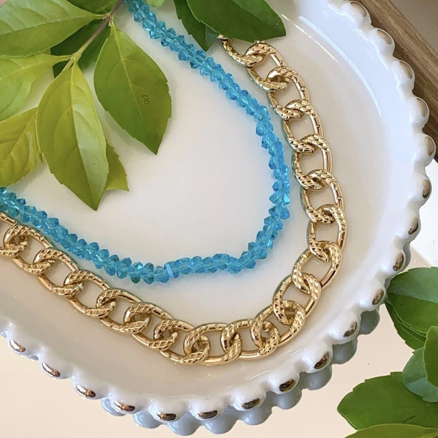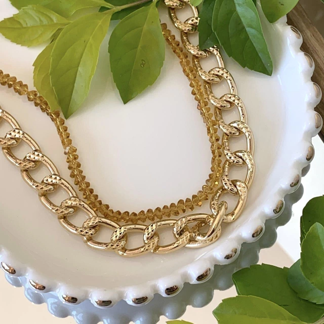 Mix com dois colares individuais, podendo usar juntos ou separados. Sendo um em correntaria e outro em cristais.