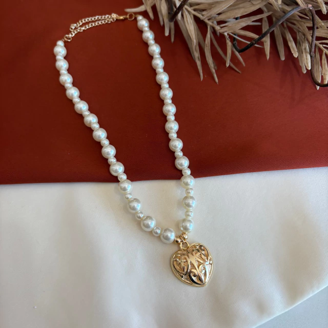 Colar de pérolas com dois tamanhos e pingente de coração dourado trabalhado