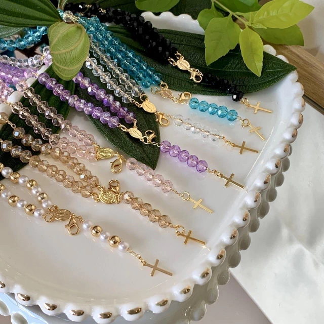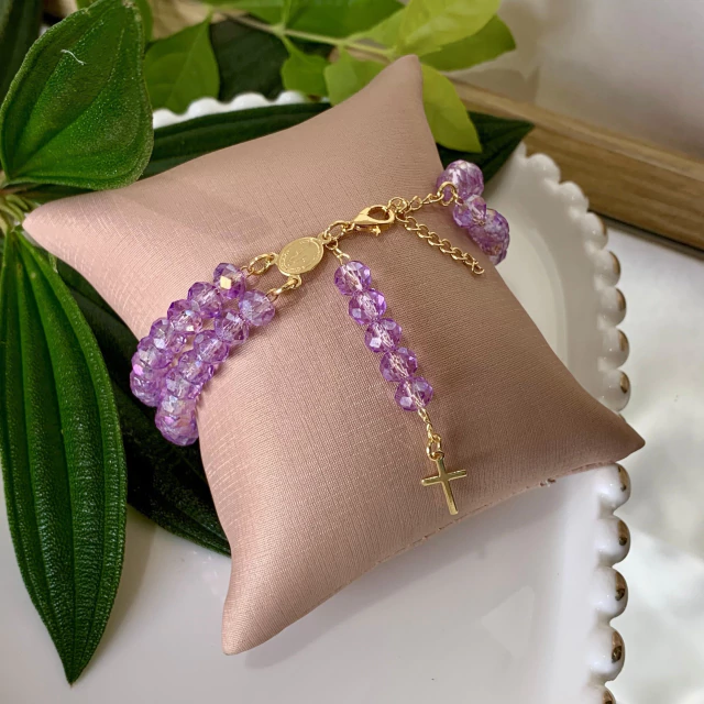 Pulseira estilo terço, com medalhinha de Nossa Senhora das Graças e Cruz. Cores em miçangas de cristais