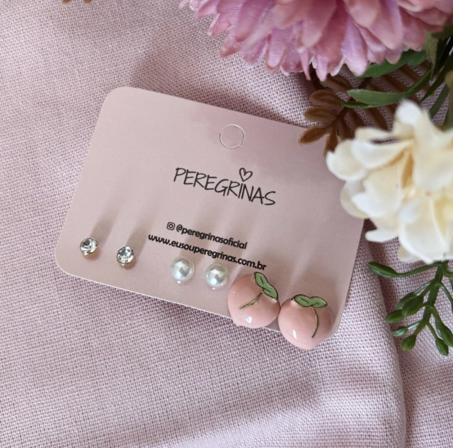 Cartela com três pares de brincos, sendo um em ponto de luz, um com pérola e outro de frutinha esmaltada